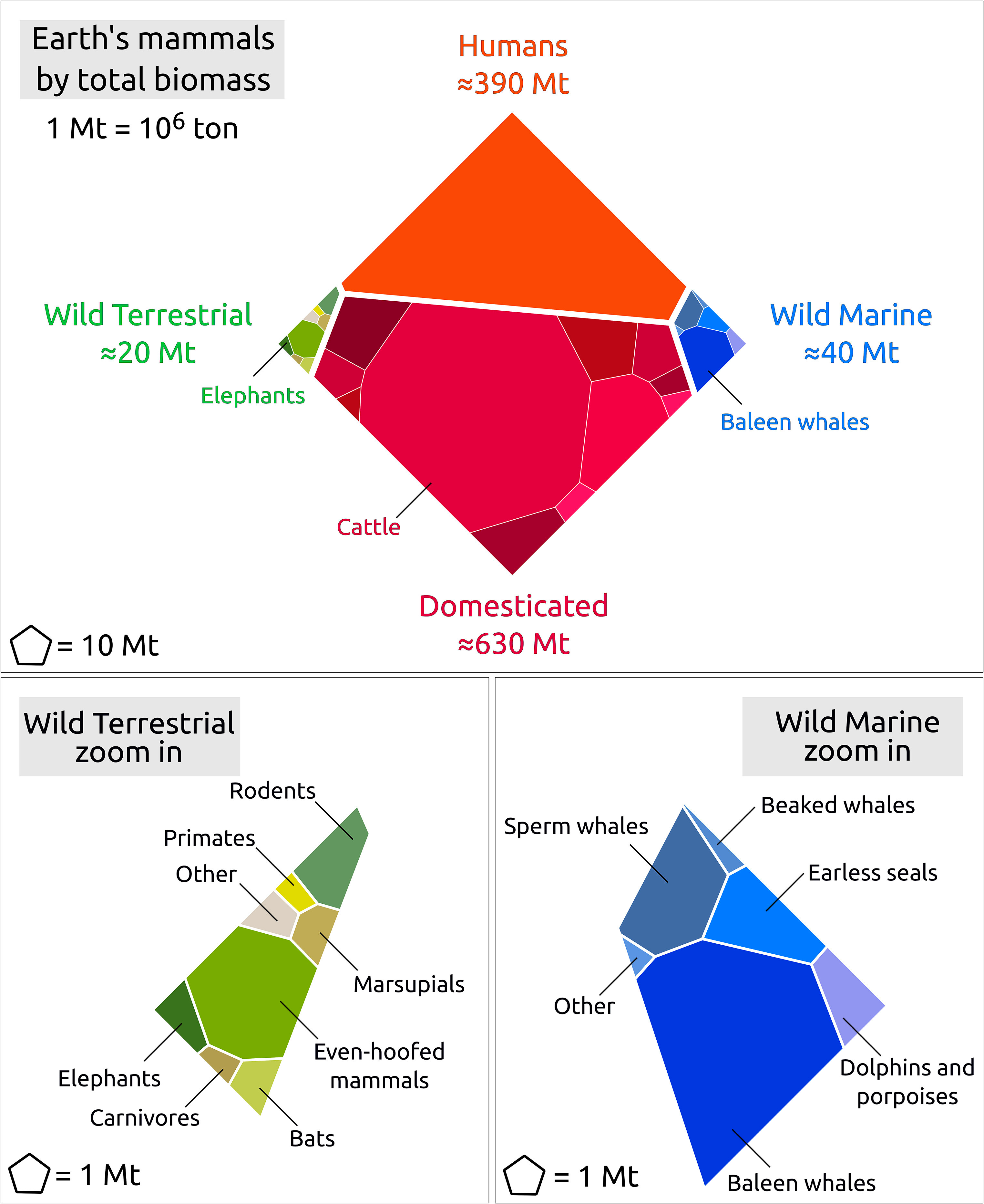 Remember that we’re only talking about mammals. Comparing wild vs. domesticated birds or fish is even more complicated. Even though there was a mind-boggling total of over 25.6 billion individual poultry birds in 2018, wild birds still outnumber them by 2:1. It’s unlikely that farmed fish outnumber wild fish despite the depletion of “fishstocks”. The oceans are big.